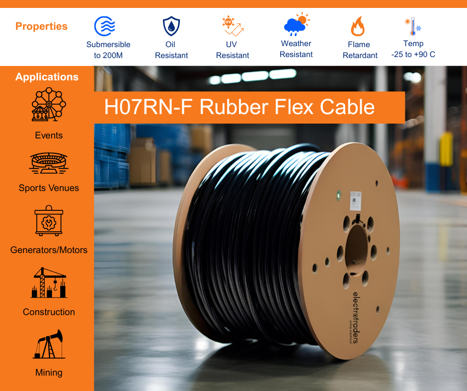 - Made of H07 Grade Rubber Flex which is sheathed in a Black Insulation that is Chemical/Oil Resistant and Flame Retardant