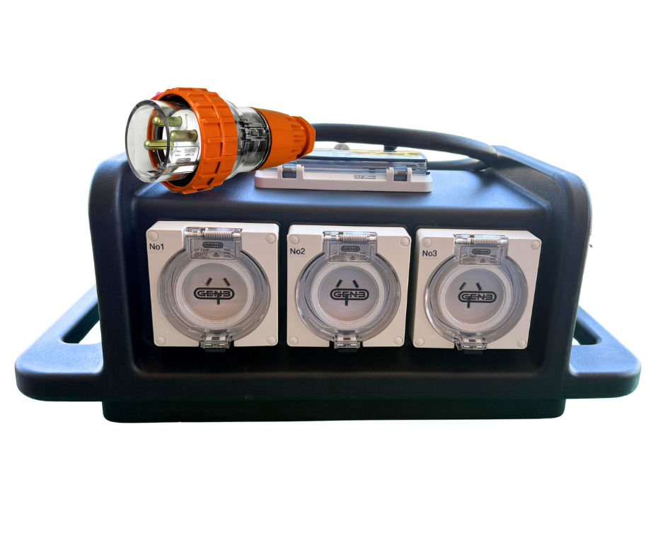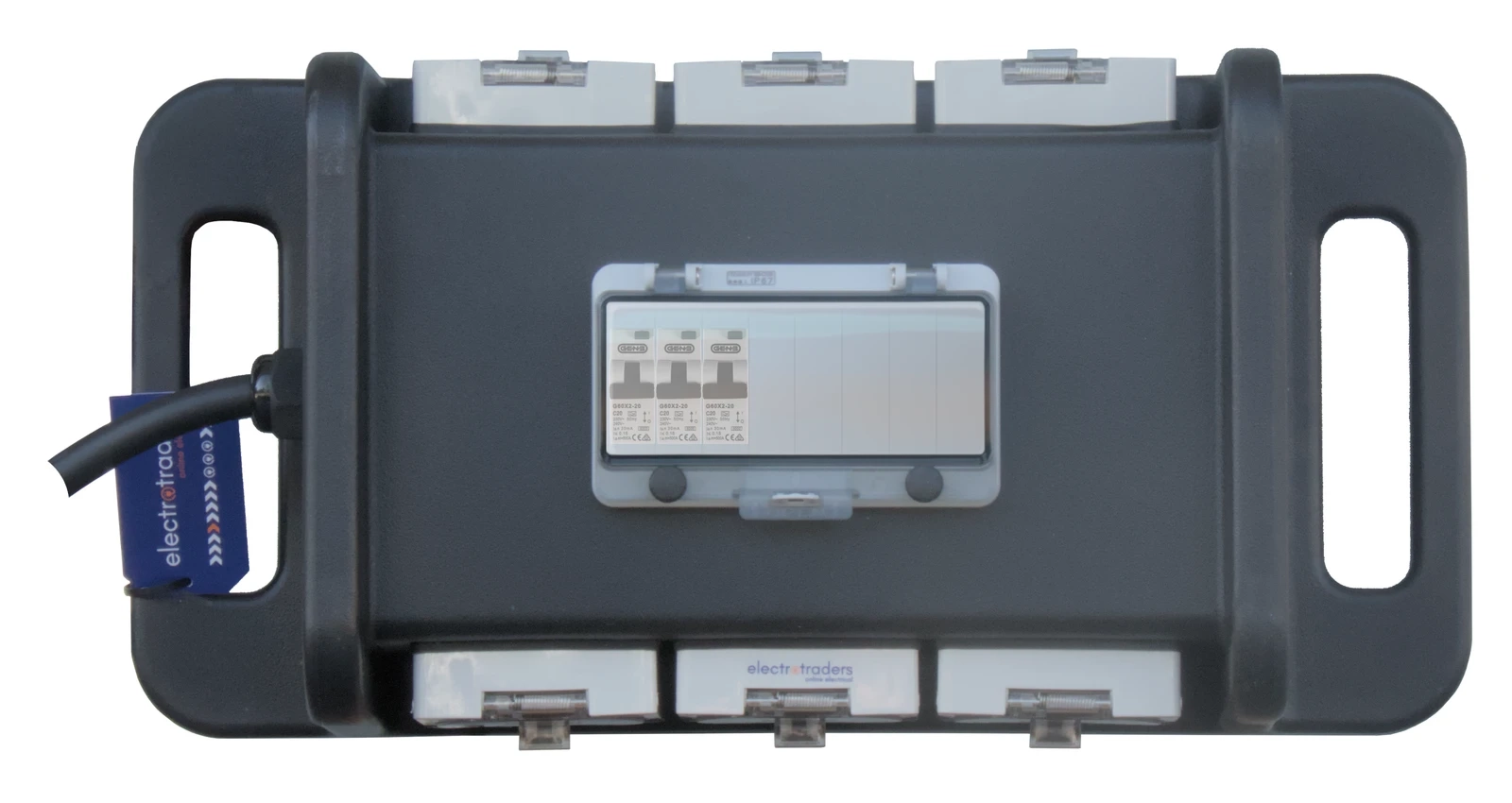 The all new DistroLite by Electrotraders, a stackable medium size distribution box providing many single phase sockets from a three phase supply, to power your work or event site.