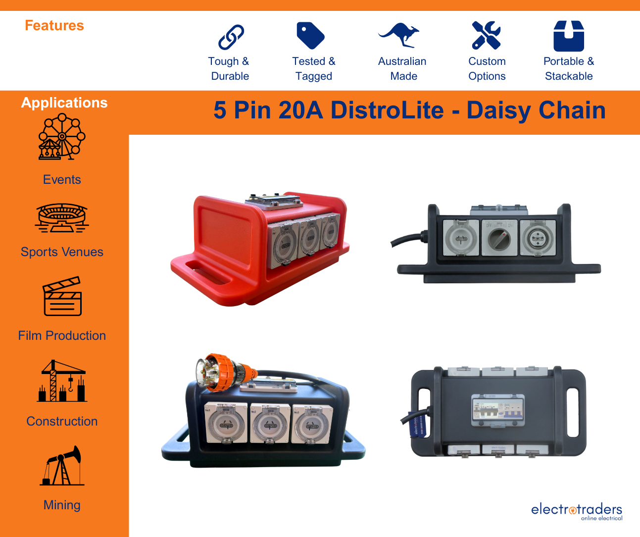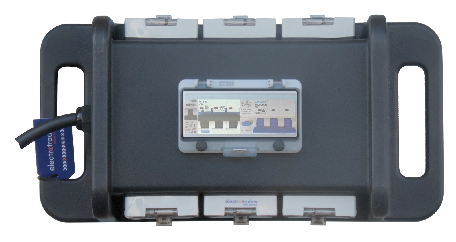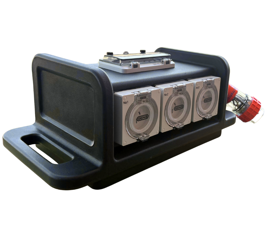 The all new DistroLite by Electrotraders, a stackable medium size distribution box providing both single and three phase sockets from a three phase supply, to power your work or event site.