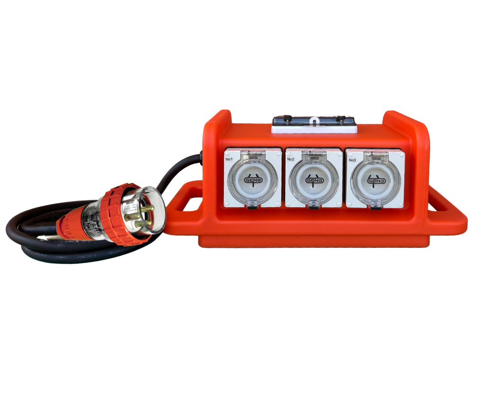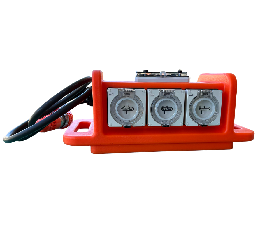The all new DistroLite by Electrotraders, a stackable medium size distribution box providing many single phase sockets from a three phase supply, to power your work or event site.