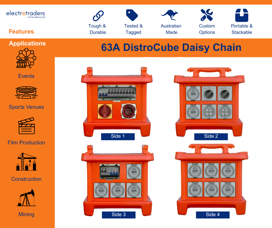 The all new DistroCube by Electrotraders, a stackable cube distribution box providing ample single and three phase sockets from a three phase supply, to power your work or event site.