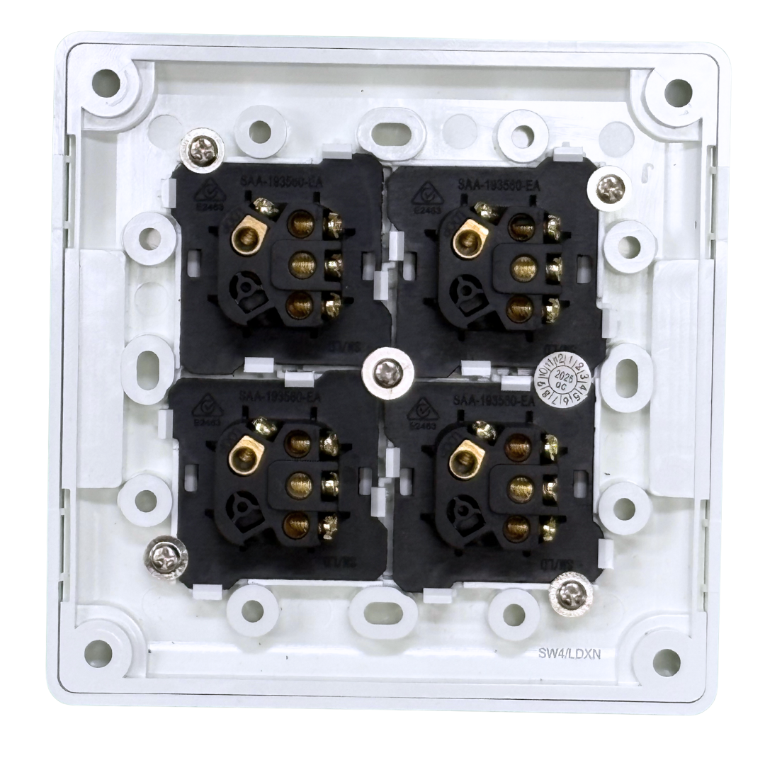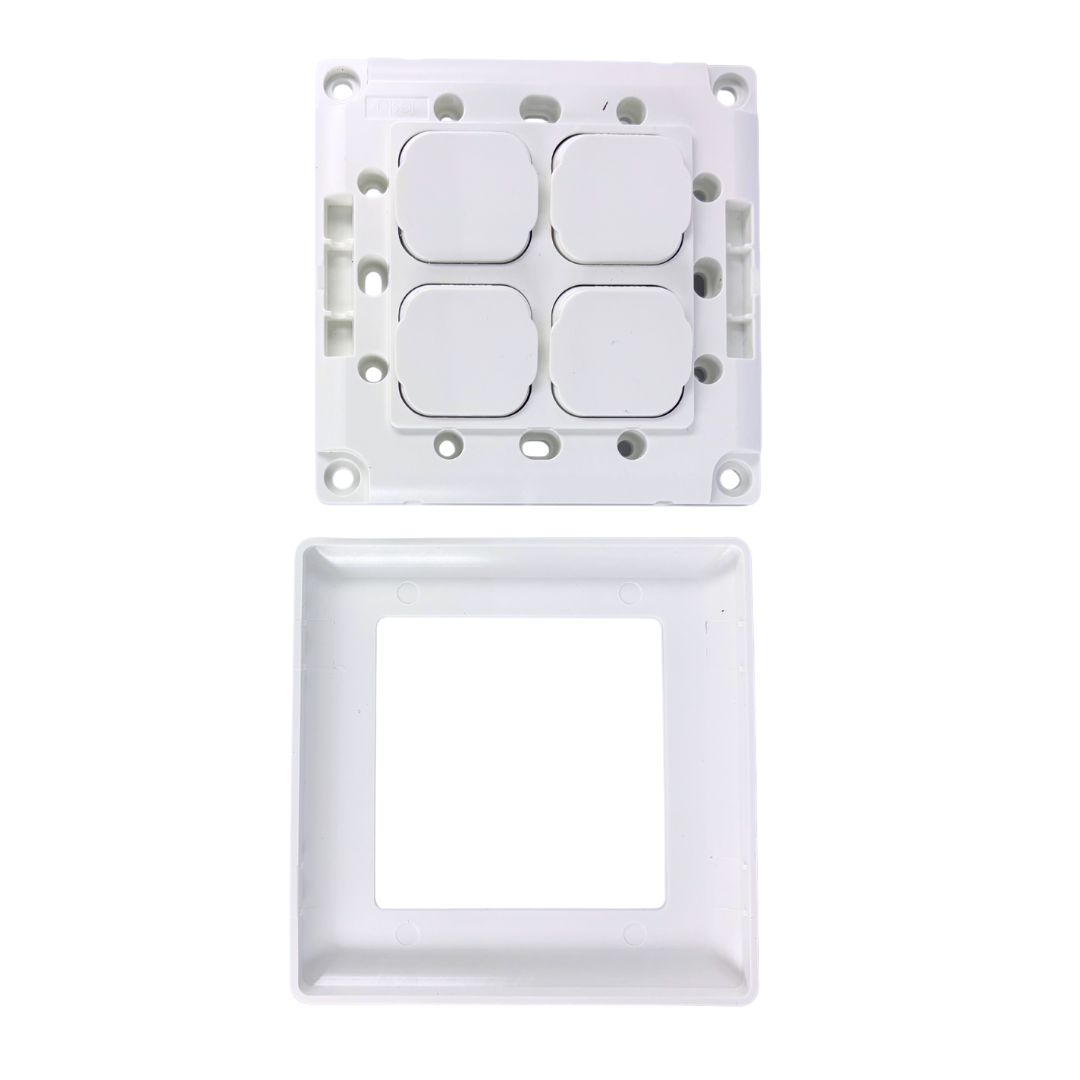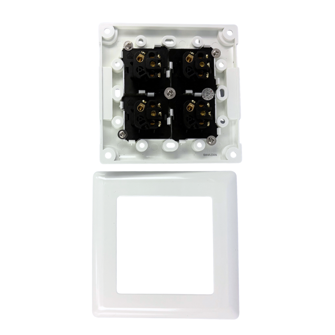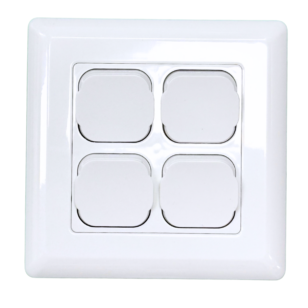 Tesla XL Dolly 4 Gang Switch – NDIS Compliant Four-gang dolly switch set on an extra-large plate. Ideal for large spaces needing easy-to-use multi-light control, including accessible homes, clinics, and aged care.