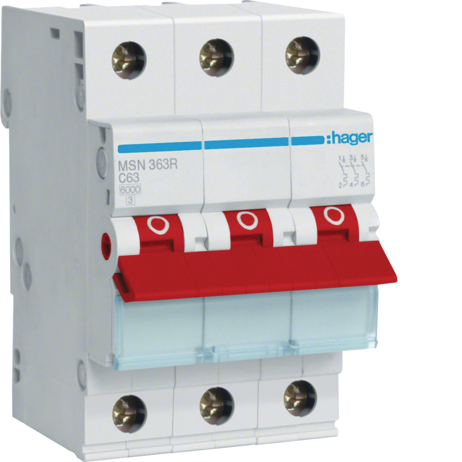 Hager MSN363R 63 Amps 3 Pole MCB Circuit Breaker 6kA (Red Toggle)