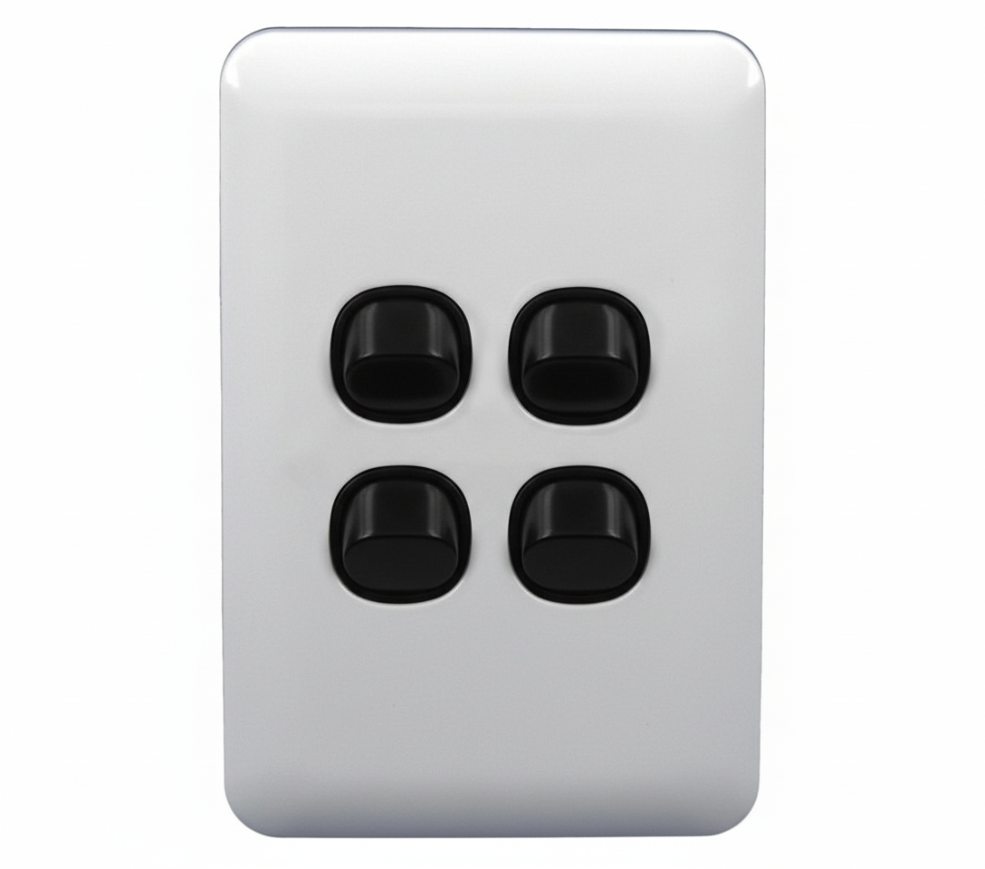Wafer 4 Gang Slim Light Switch Extra Low Voltage 12-24V White with Black Switch S4W and SMW/B