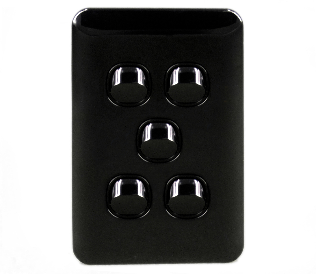 - Form Factor: Slim Wafer style black plate with 5 Gang(s). Choose between the classic form for standard fittings or Architrave for slimline installation in narrow spaces (door frames, skirtings).