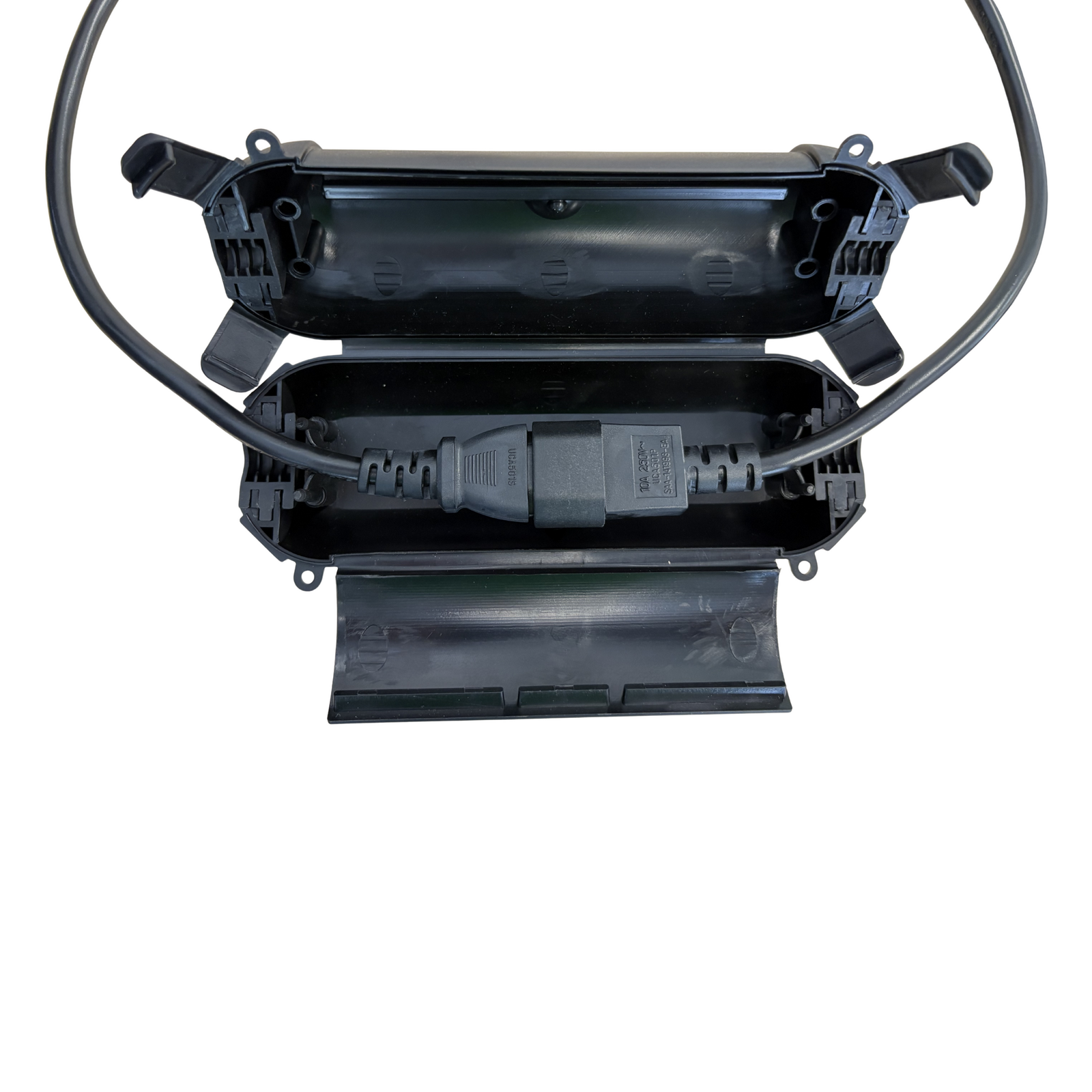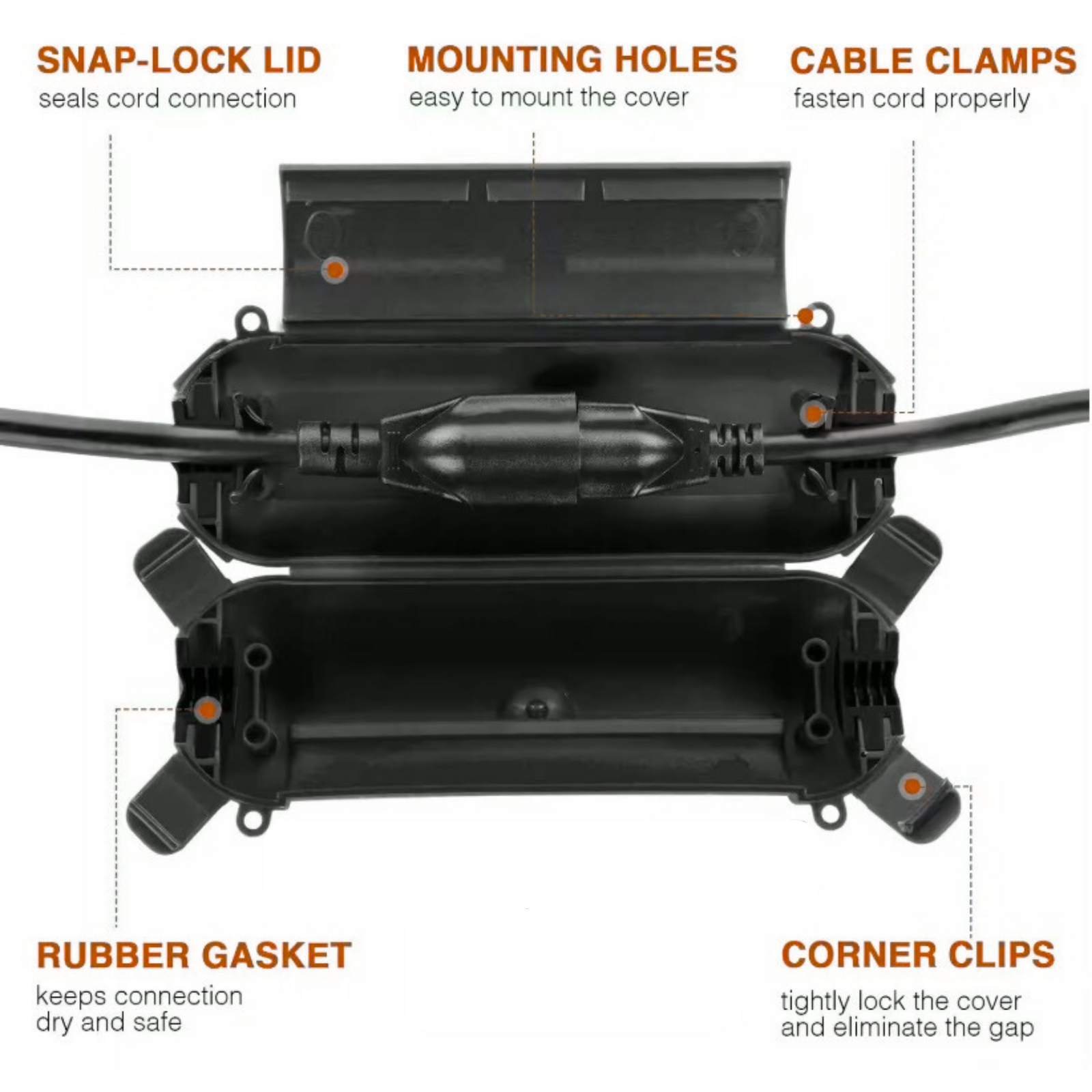 Compact and practical, this black enclosure keeps plugs and sockets shielded from rain, dust and debris, while maintaining a clean, professional setup.